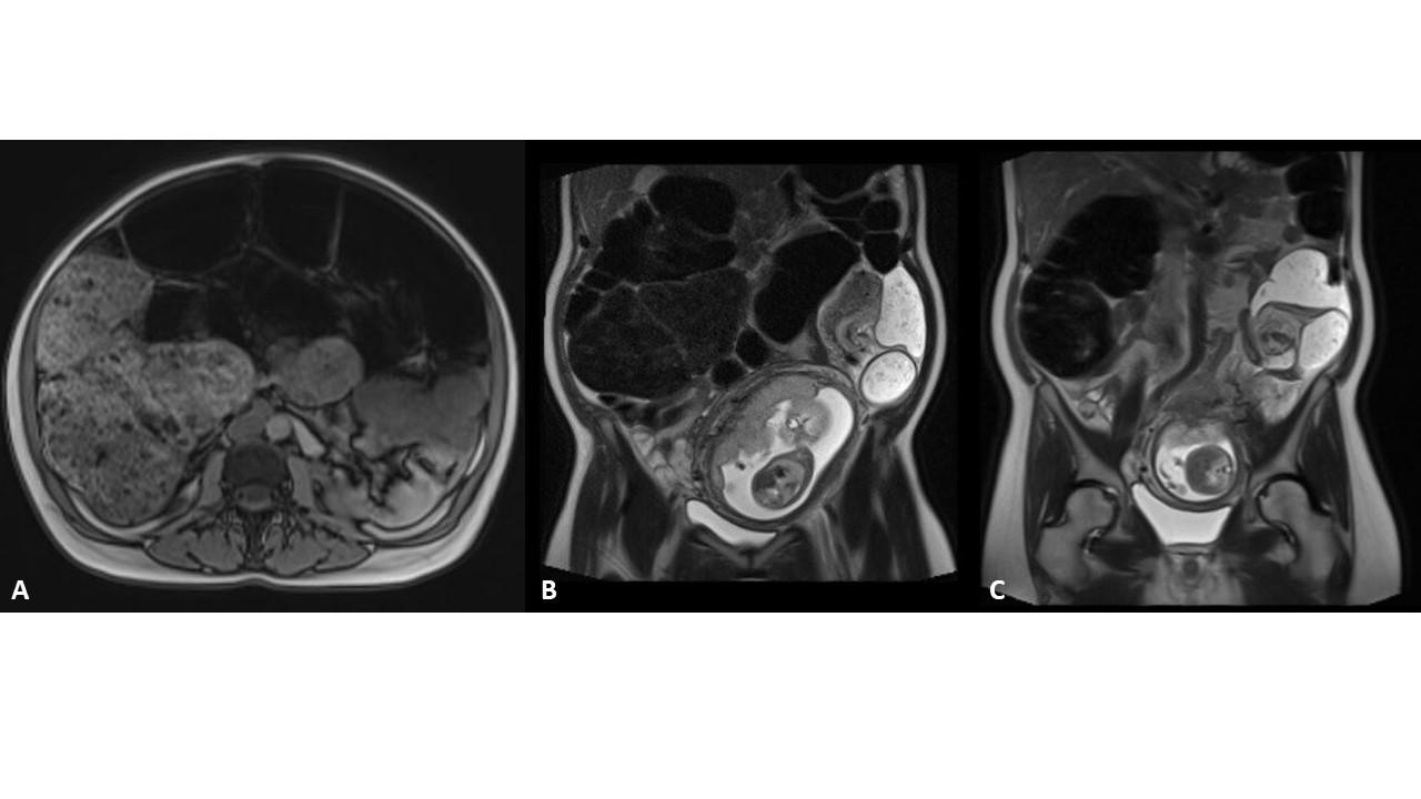 A 40-year-old pregnant woman presented with acute constipation and abdominal distention. A sigmoid volvulus was diagnosed (Figure 1). There was a transition point in the sigmoid colon with a “mesenteric swirl sign” (Figures 1B, 1C).