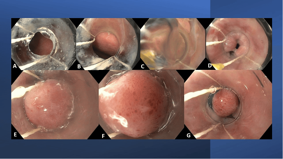 h) After the band has been released, no more suction should be applied. Indeed, soon after releasing the band we gently apply some air, and minimal amount of water (using the water pedal). Simultaneously, we pull the scope back a little bit. This combination of maneuvers (air, water and pulling the scope) “detaches” the suctioned varix (Figure 3G).