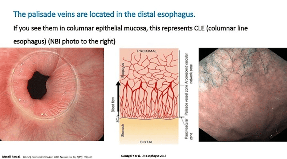 a) Determine the varix to be banded. This is accomplished by evaluating red markings or spots. In addition, banding should mainly be done to the distal 5 cm of esophagus, as it is extremely rare that varices in the mid-esophagus bleed. The highest-pressure gradients are at the GE junction and Z-line. Remember that the varices originate from the palisade veins located in the distal esophagus (see here https://community.endocollab.com/posts/25008135?utm_source=manual) (Figure 2, below)