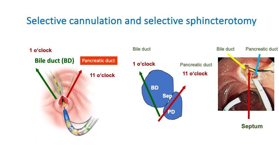 Figure 1. Cannulation and sphincterotomy directions. The septum between the biliary and pancreatic ducts is another crucial anatomical feature to consider. Understanding its position can aid in selective cannulation and help avoid unintended damage during sphincterotomy.