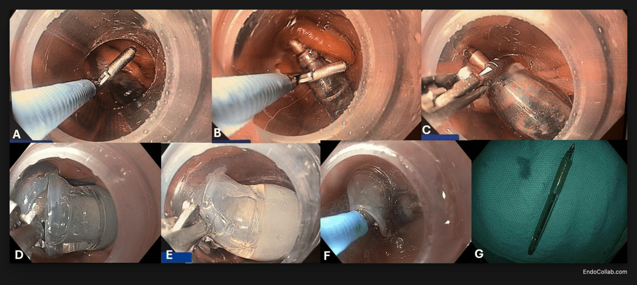 The cap is larger than any existing transparent cap and allows for suctioning most of the impacted meat inside. Its distal diameter is 16 mm with a cap length of 26 mm (effective “catch length of 22 mm) (Figures 1A-C). This results in an inner cap “catch-volume” of approximately 5 ml, which is almost double to that of traditional distal transparent caps. Another big advantage of this cap is its softness (elasticity, figures 1D-E), which allows for smooth introduction into the esophagus (Fig. 1F). Once inside the stomach the cap can be placed against the mucosa, which turns it into oval shape, thus increasing the ability to pull back a sharp end of the foreign body such has the pen tip, inside of the cap (Fig. 1G). Using a Raptor, rat-tooth or alligator forceps is mandatory, was it is important to tightly grab the pen. A snare may be an option, but too often the snares slid off pens and pensils, especially if the object has been inside the stomach for several outs and is now covered by mucus and secretions. Specific tricks to remove a pen from the stomach are (Figure 2):