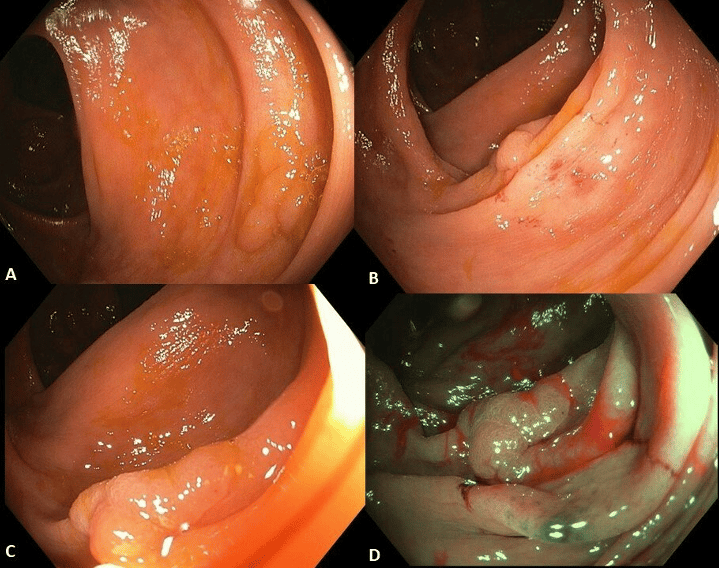 A flat polypoid lesion was found in the ascending colon (A). As this lesion was larger than 10 mm, by definition it’s an LST (laterally spreading tumor).