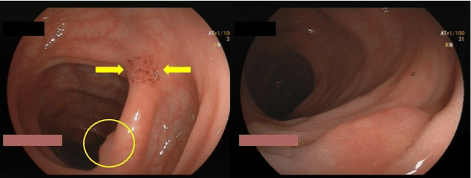 How to do the suction mark trick? Focus on the lesion, push the scope towards it and suction the mucosa right next to it. This creates a red submucosal suction mark (yellow arrows), which then becomes pivotal to re-identify or relocate the polyp (yellow circle).