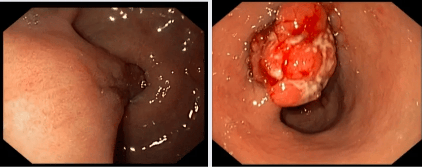 Since the patient was currently on ASA and clopidogrel, several biopsies were taken. He is probably a poor surgical candidate. CT scan was negative for enlarged regional lymph nodes and distant metastases.