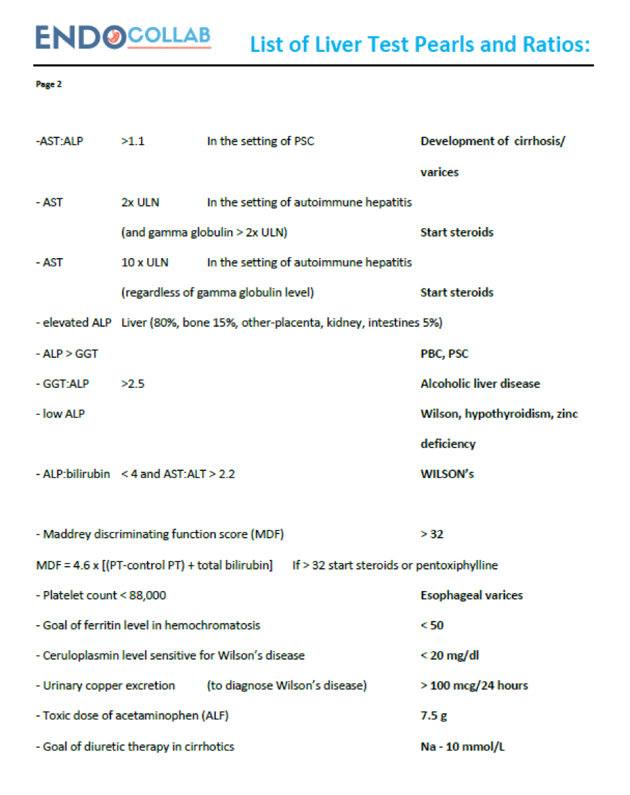 I hope this summary of liver tests, rations and some other liver-related values is useful for your practice. Of course, this list just represent a broad collection of data, based on clinical experience and literature review, especially for GI board preparation and does not constitute a certified guideline. Please feel free to add, correct and comment as needed. I am happy to receive feedback to continue expanding this list.