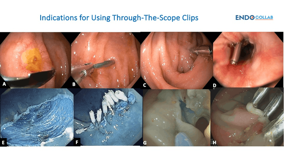 Hemoclips are multifaceted tools that currently are used beyond their original purpose of hemostasis, and therefore we will refer to them as “clips”.These clips are now employed for closing perforations, post-resectiondefects, marking, and attaching devices such as stents and feeding tubes. For instance, in a procedure involving a gastric, esophageal or colon perforation, clips can effectively seal the defect, preventing further complications. Figure 1 shows several clinical applications of clips. A. Duodenal ulcer with visible vessel. B. Clip being pushed towards the lesion. C. Released clip closing the duodenal ulcer. D. Clipped Mallory Weiss tear. E. Large post-resection defect in the cecum. F. Complete prophylactic closure of the defect. G. Perforation of the cecum during endoscopic resection of fibrotic polyp. H. Complete closure of the defect with clips.