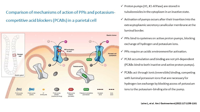 Conventional proton pump inhibitors (PPIs) are the main first-line therapy to treat acid-related disorders (1). However, they have a number of limitations including slow onset of action, influence by cytochrome P450 polymorphisms, unsatisfactory effects at night, and instability in acidic conditions (1). Potassium-competitive acid blockers (P-CABs) induce a rapid, long-lasting, and reversible inhibition of the gastric hydrogen potassium ATPase, the proton pump of the stomach (1). These agents have a faster onset of action than PPIs, and they have a more sustained action in inhibiting acid secretion. Thus, they represent a new option to treat acid-related disorders. Herby we summarize the mechanism of action of PCABs.