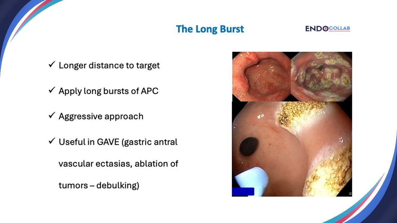 Settings and probes may need to be adjusted based on location (esophagus, stomach, small bowel, cecum, colon, rectum) and disease process (tumor, active bleeding, Barrett’s esophagus, polyp remnants). Nonetheless, it is important to remember that the application of APC is dynamic. For example, using low wattage setting, but firing straight into a spot in the small bowel repeatedly or for several seconds may directly result in perforation. Indeed, deep tissue damage and destruction of tissue may sometimes be desirable, such as ablating residual tissue from polyps, or debulking of tumors. On the other side, using high power settings with a longer distance between the probe and tissue while using a painting motion may result in superficial damage. Thus, blindly relying on pre-selected settings may give a false sense of security. Therefore, we highly recommend understanding how to use the APC machine to change settings for the most appropriate application, and most importantly, using APC dynamically while considering all factors (power, flow, duration, direction and distance) during the application process.