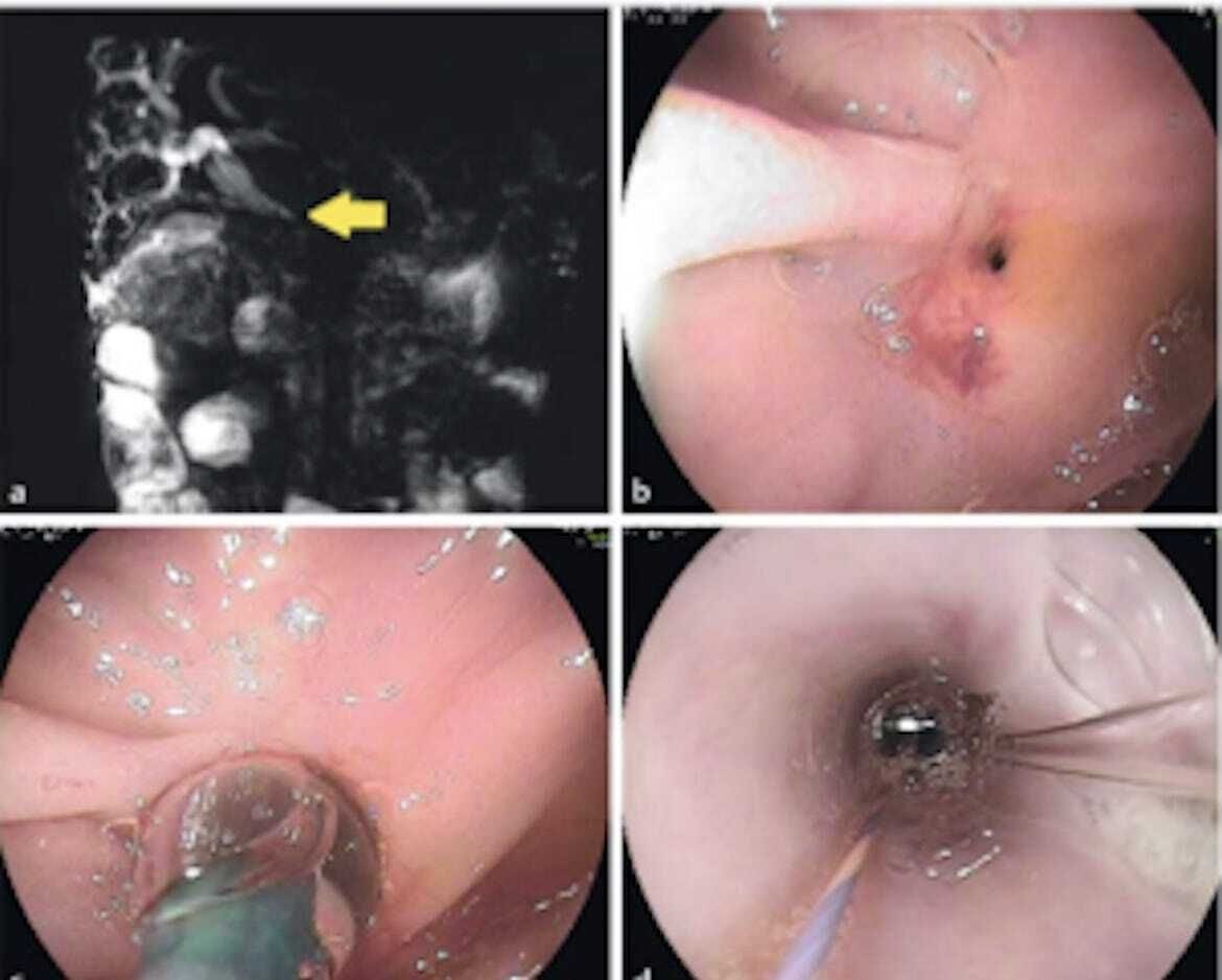 Fig. legend: Balloon-assisted endoscopic retrograde cholangiopancreatography. a Magnetic resonance cholangiopancreatography revealed a tight distal bile duct stricture (yellow arrow). b Tight opening of the hepaticojejunostomy. c Balloon dilation of the hepaticojejunostomy. d The balloon-assisted enteroscopy overtube worked as a giant working channel. The wire was left inside, connecting the bile ducts to the operator. The operator then advanced a fully covered metal stent, over-the-wire and through-the-overtube, using radiological guidance, and then successfully inserted the stent inside the bile duct (3).